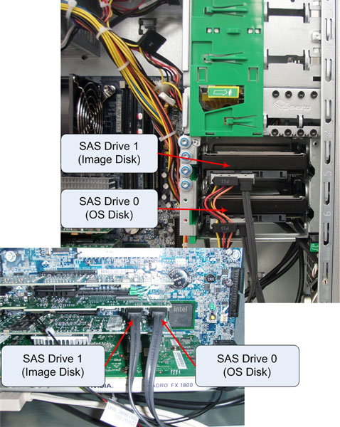 The SAS Controller Card is inserted in Slot 2 on the Z400 Host Computer motherboard, with the connection between controller and disk drives supplied via SAS cables. (See Figure 4).
