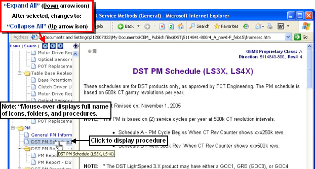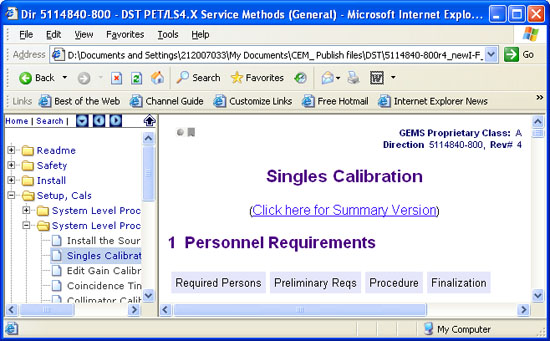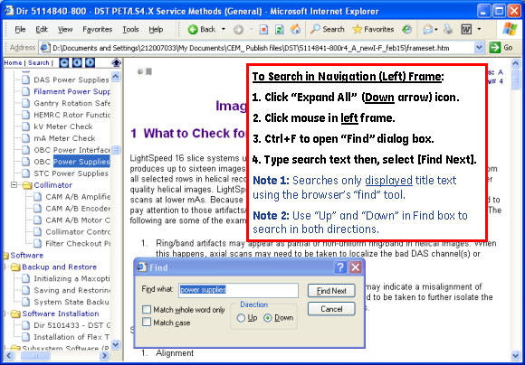 If available, the publication-level search tool (use the Search button) can be used to search ALL content modules in the publication. However, to quickly search just the text displayed in the Navigation Frame or Display Frame, use the web browser's standard "Find" tool.Figure 6 shows how to do a simple search in the procedure titles (example shown for Microsoft® Internet Explorer web browser).