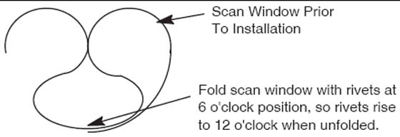 Shape the scan window as shown in Figure 6, and nest the scan window at the bottom of the opening between the front and rear covers, (Figure 7) with the rivets in the 6 o’clock position. Remember the rivets must be in the 12 o’clock position when the mylar window is fully installed.