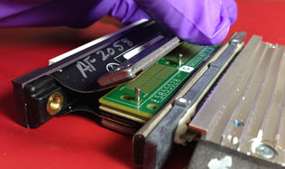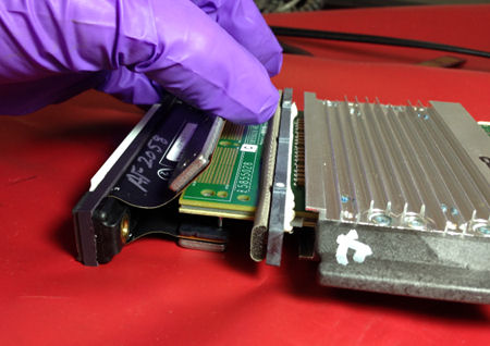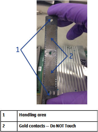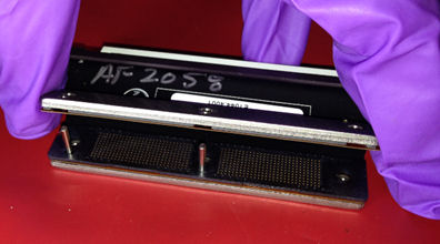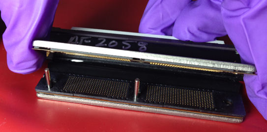 Carefully remove one interposer from the package. Only handle the interposer by the ends and absolutely AVOID touching the gold contacts on the interposer.