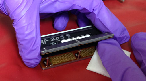 Carefully clean the contact pads of the A/D sandwich on both sides using the provided alcohol wipe. Always use a new alcohol wipe for each module.