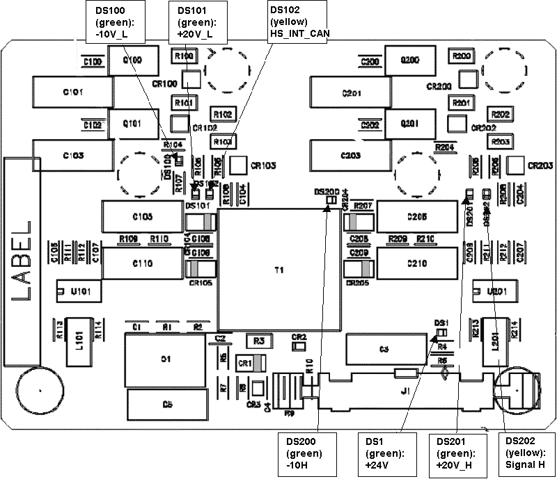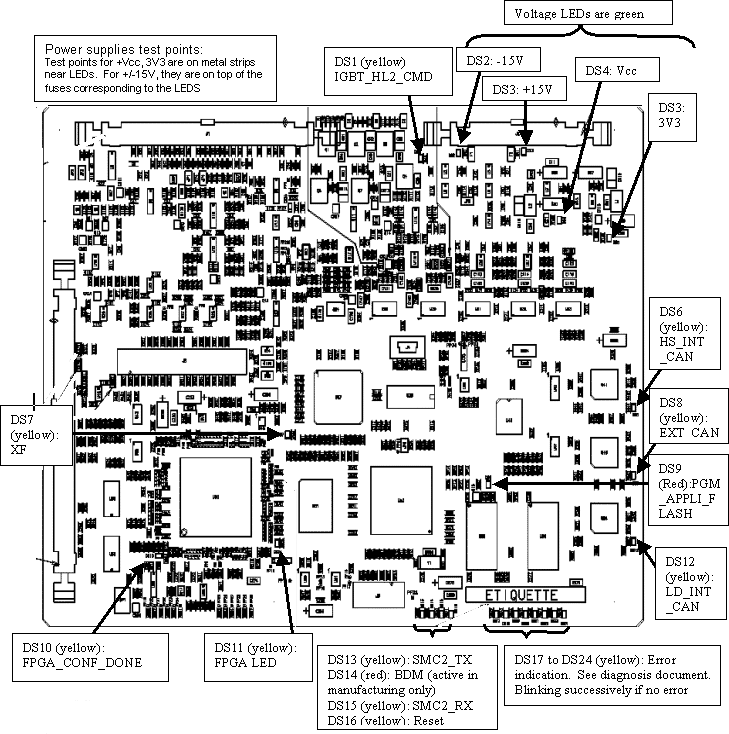 Application mode: LEDs DS17 to DS24 are lit successively more slowly. The power up self tests are completed, PPC kV control board is up and running.