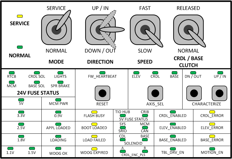 9. Wait at least two minutes before verifying power is OFF at the table electronics cage. After two minutes all LEDs on the RTCB, MCM’s, and 160V power supply should be OFF.