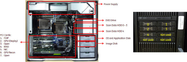 Five Scan Data Disks are connected to the RAID card that enables hardware RAID5 (approximately 512 Gigabytes).