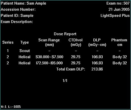 Figure 4. Dose Report Screen when GE Medical Systems X-Ray Tube is installed in System (Example Shown)