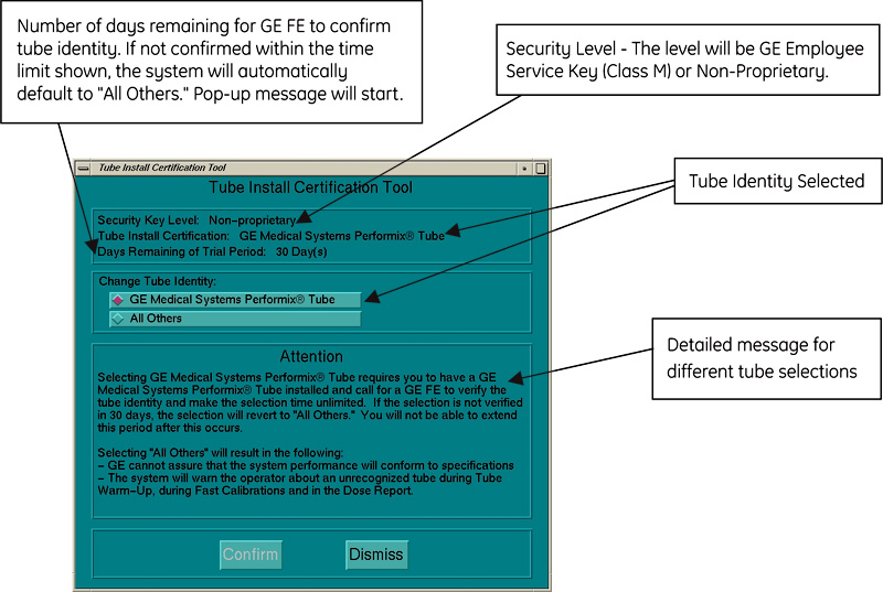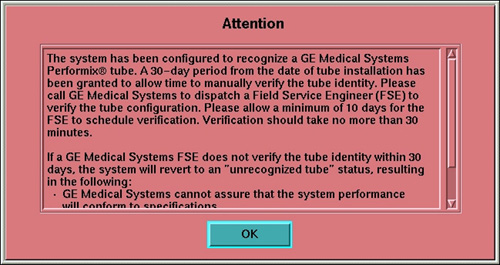 Figure 3. Message at each boot up when GE Tube is selected but not verified by GE Field Engineer