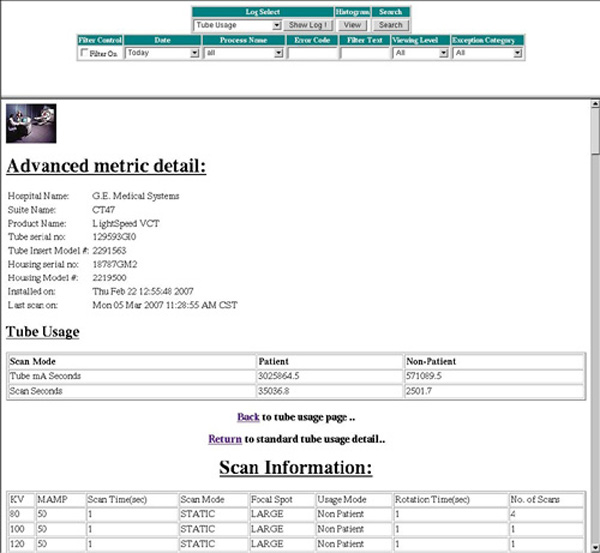 The Tube Usage Default Details Screen includes a link to an Advance Metric subscreen. The Tube Usage Details Advance Metric screen presents the same selected Tube Unit information and Site information, in addition to reporting “Patient Tube mA Seconds”, “Non-Patient Tube mA Seconds”, “Patient Scan Seconds”, “Non-Patient Scan Seconds” and scan details for the selected Tube Unit. (See Figure 6.)