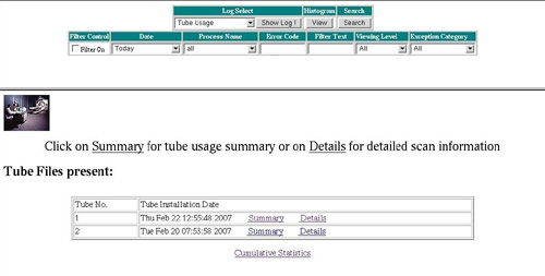 You can display the Software Health Page by selecting Software Health Pagefrom the Log Select menu and pressing Show Log. The Software Health Page includes a link to a Cumulative Tube Usage Statistics Screen, as shown in Figure 8.