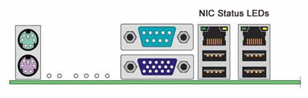 An integrated Dual Gbit Ethernet controller on the VeRB2 motherboard handles network interface support for the VeRB2 computer. Each network interface controller (NIC) drives two LEDs located on each network interface connector. The Link/Activity LED at the left of the connector indicates connection when on, and transmit / receive activity when blinking. The Speed LED at the right of the connector indicates data rate. See the following illustration for NIC LED status.