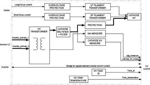 The cathode kV is measured and reported to the kV control board for kV regulation, kV safeties and tube spits detection. mA measurement is made in the anode side of the transformer and transmitted to the kV control board for mA regulation and safety.