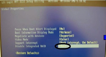 For Global Properties, navigate via the down-arrow key to Disable Integrated Raid and select the following per screen instructions: