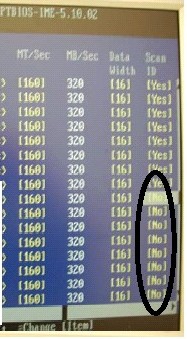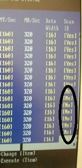 Use the arrow/space keys to navigate to SCSI IDs 8 through 15. Then use the instructions per the screen at each Scan ID column setting to select No to disable the SCSI IDs.