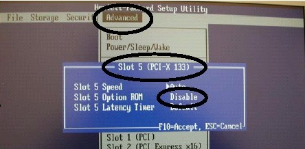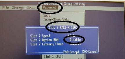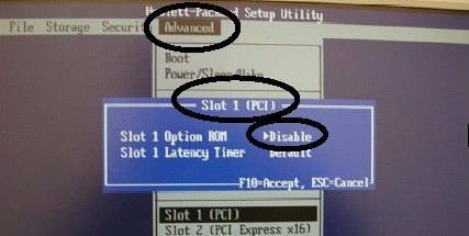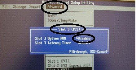 Disable PCI Slot 1 Option ROM, then press F10 to save settings.