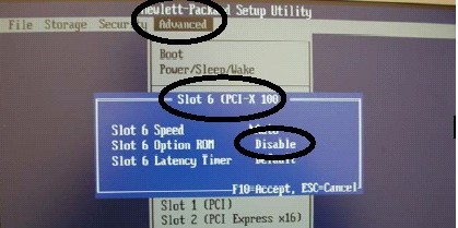 Disable PCI Slot 6 Option ROM, then press F10 to save settings.