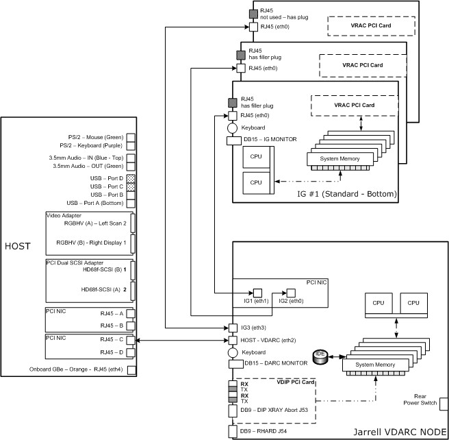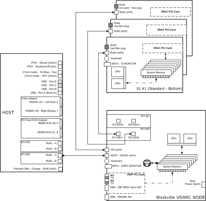 The following illustrations show the Ethernet connections between the various Nodes–Host, VDARC, and VIG. Two versions are provided and are specifically referenced to the particular VDARC Node version (Westville or Jarrell). The Westville VDARC Node rear panel has 6 Ethernet ports available for connection between the Host (1 port) and the VIG Nodes (5 ports available, although only 3 are used). The Jarrell VDARC Node rear panel has 4 Ethernet ports available for connection between the Host (1 port) and the VIG Nodes (3 ports). The VDARC Node Ethernet address associated with the Host or with each VIG Node is not the same specifically because the number of ports available for each VDARC Node version is different.