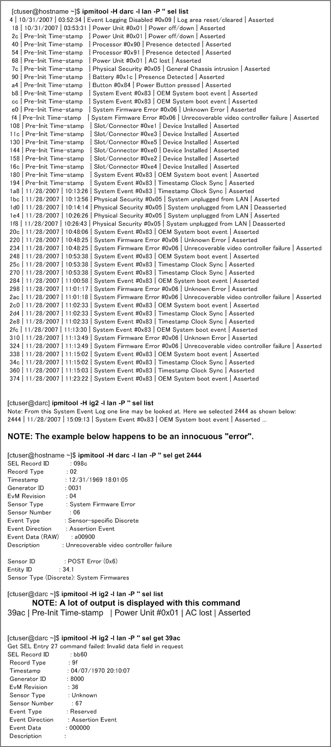 The following example (Figure 5) shows the current System Event Log (lots of noise!) of the host described by the "-H" option with 07MWxx.x software and the command to select a record ID.