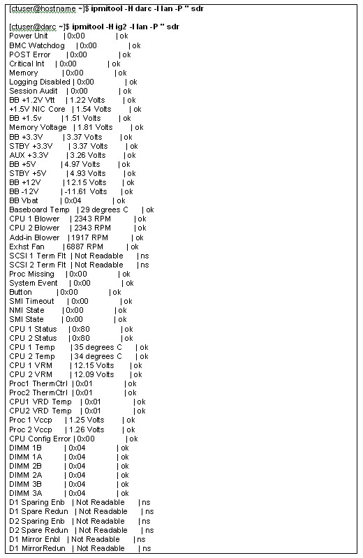 The following example (Figure 3) shows the current sensor state (in/out of spec) of the host described by the "-H" option. The sensors –v command has been replaced due to garbled output in 07MWxx.x software.