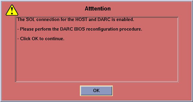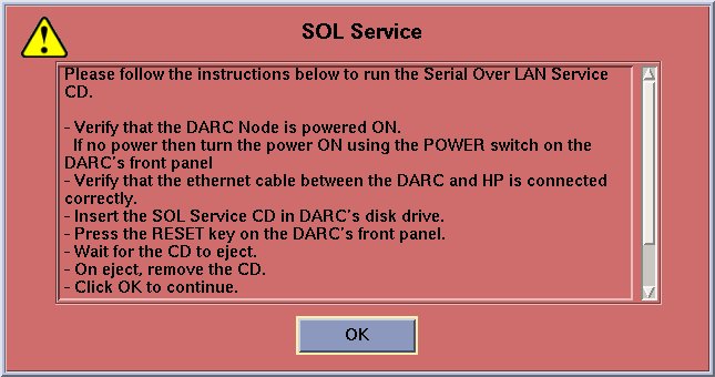 The SOL CD is installed in the DARC Node and the front panel buttons are utilized to reset the DARC Node. The SOL is then flashed/written to the BMC on the DARC Node. The SOL CD is ejected automatically. The OK button on the pop-up is then selected and the DARC OS load continues.