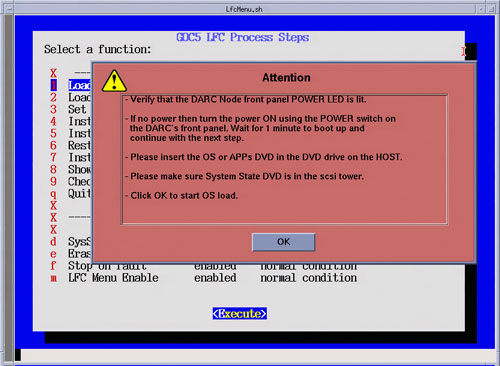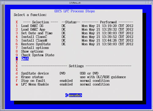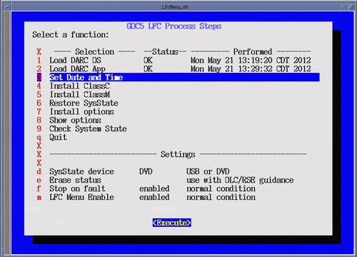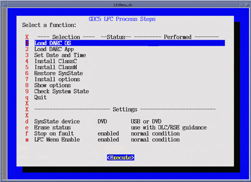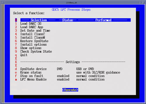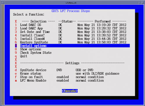 After selecting Execute, a shell window will open and the Install Software Option Utility will be launched. Upon completion of the Install Software Options Utility, a pop-up will appear reminding the user that a reboot will be required. Click OK. Close the shell window to return to the LFC Menu.Figure 29. LFC Menu - Install Options Selection