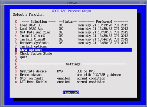 After selecting Execute, a shell window will open and the current installed Options will be displayed. Upon completion of the Show Options, close the shell window to return to the LFC Menu.Figure 30. LFC Menu - Show Options Selection