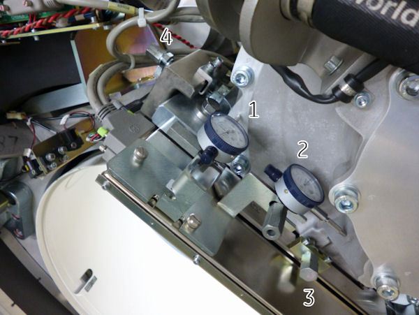 Figure 2. Dial Indicator Mounting and Adjustment Screws Locations (Performix VCT Plus / Performix HD Plus, Liquid Bearing)