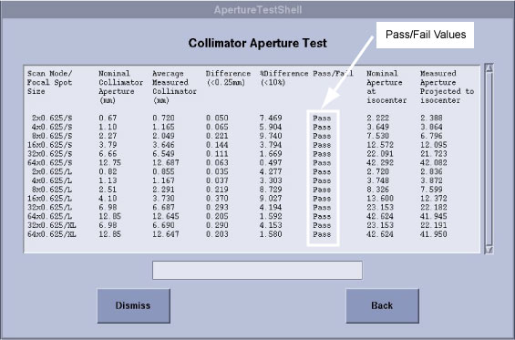 6. The tool will let you know if it passes. An example of the test results is shown in Figure 2. The various cam positions are recorded and can be used to evaluate the beam aperture during scanning.