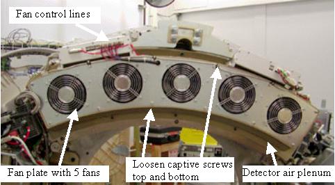 - When power is restored to the gantry, check to make sure all 5 plenum fans are running. Use a piece of paper or similar object to make sure fans are pulling air into the plenum. A fan that is not running will still have the fan blades moving as air is pushed back out of the plenum through that fan port.