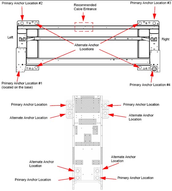 If you cannot use one of the adjuster anchor holes due to structural interference, such as reinforcement bars in the concrete, you must use one of the alternate anchor locations, as shown in Figure 2. You must also move the respective leveler(s) and pad(s) to the new alternate location(s) and re-drill.