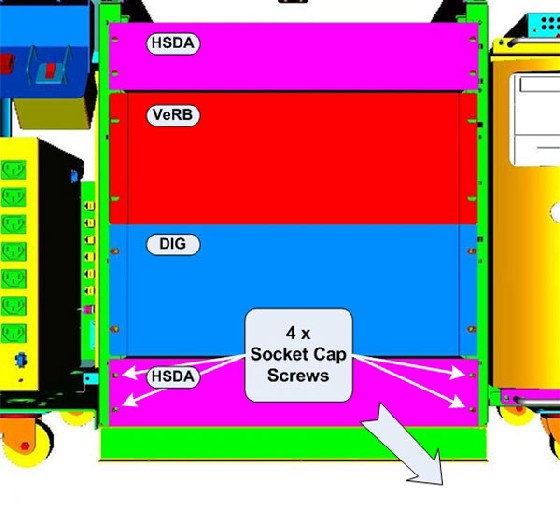 5. Remove the four (4) 5mm socket cap mounting screws from the front of the HSDA chassis, holding the chassis to the Operator Console rack.