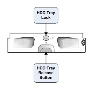 1. To remove an HDD Tray from the HSDA Assembly, unlock the HDD Tray Door, press the HDD Tray Door Release Button, and pull up and out on the HDD tray.