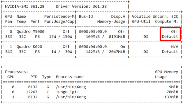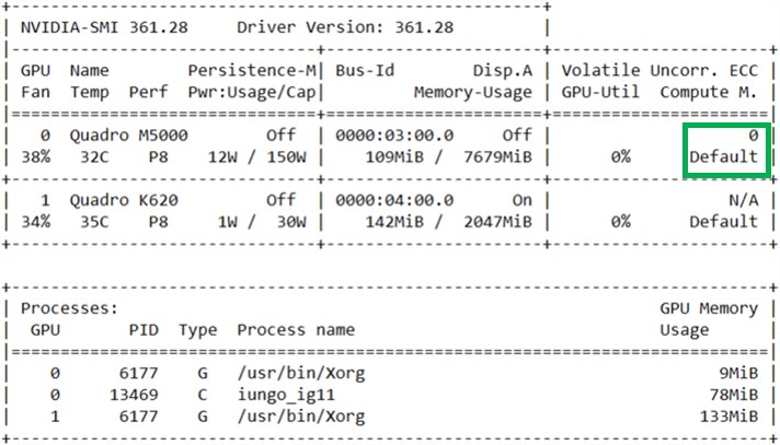 - If the GPU ECC is ON, below is what the output would look like (boxed in green):