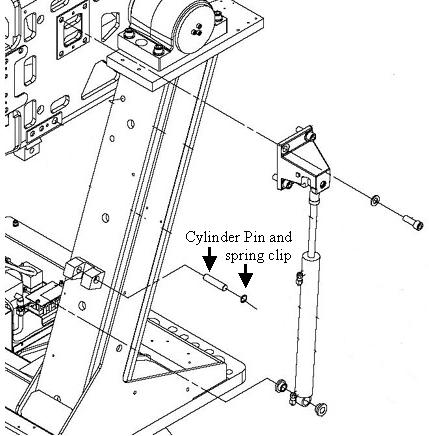 - Remove the spring clip from the pin holding the bottom of the cylinder. Push the pin out from the inside of the gantry toward the outside to release the bottom of the cylinder from the gantry. See Figure 9.