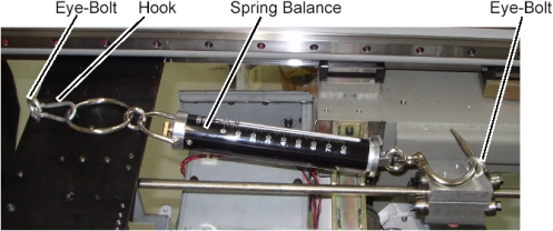 - Verify that this value is 52 kg ± 2 kg.If the value is out of specification, adjust the bearing tension by turning two set screws on the bearing block evenly (10kg/turn).