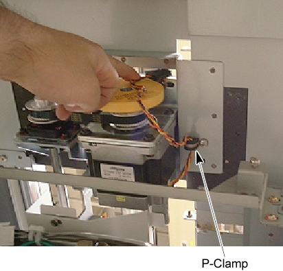 Route the motor wires through the p-clamp as shown in illustration below, and re-connect the motor wires connector, then fasten the wires to the Table bracket with tie-wraps.