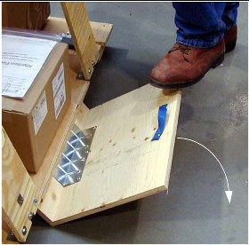 - Lift up on the strap on the front of the step-board (Figure 2) to lower the skid. Remove the step-board.