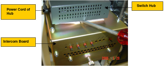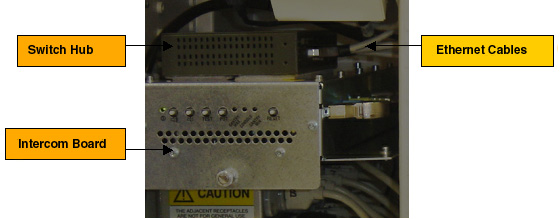 - Attach the switch hub on the new Intercom Board, reconnect five (5) Ethernet cables and power cord.