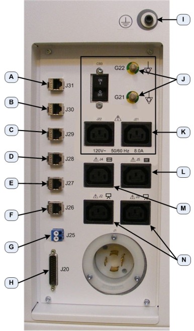 - Connect the Scan Room Patient Reference Ground cable to the rear of the GOC6/6.5 Console. (Item I in Figure 10)