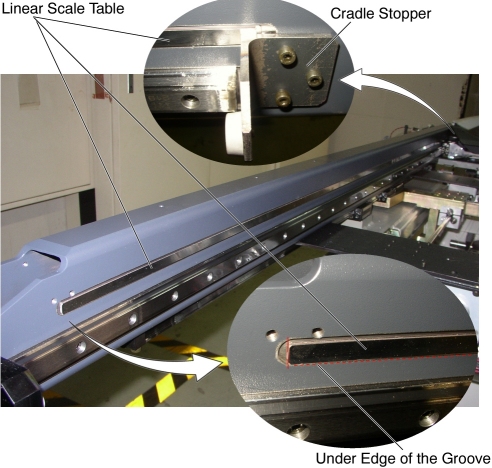 - Peel off the linear scale tape from the groove on the inside of the Table frame, and take off the adhesive tape in that place.