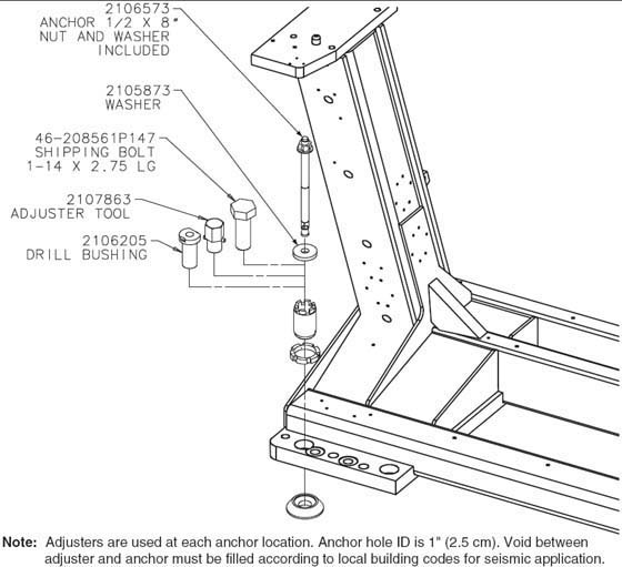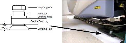 - Locate the four (4) leveling pads, and position each beneath its associated adjuster. A ½ in., ratchet and 1-½ in. socket are required to loosen the gantry shipping bolts.