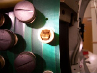The examples below show a good and bad brush block alignment. In the good example, the slip ring track is centered in the brush holder. In the example of a bad alignment, the edge of the slip ring track can be seen on the right side only.