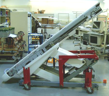 This procedure defines how to prepare the Global Table (GT) and Volume Table (VT) for transport on the Tilting Table Dolly. This dolly configuration is intended to be installed and used on site to allow the table to be transported through small areas or smaller elevators. It is not intended to be used to ship the table long distances. Figure 1 shows the table in the fully tilted position.