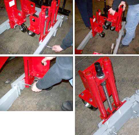 Completely relieve the dolly of the weight of the Upper Table Assembly by lowering the Caster Towers.