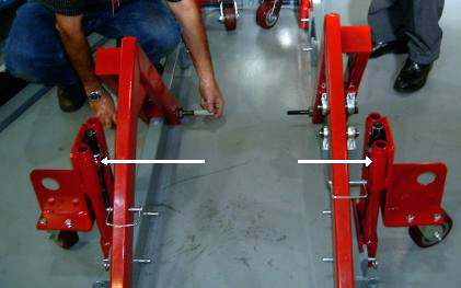 Completely relieve the dolly of the weight of the entire Table assembly by lowering the Caster Towers.