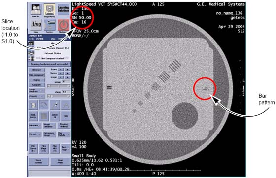 - On the GE Form e4879 Data Sheet, record the scan location (shown on the image annotation) of the image with the darkest scan plane indicator (darkest long bar).
