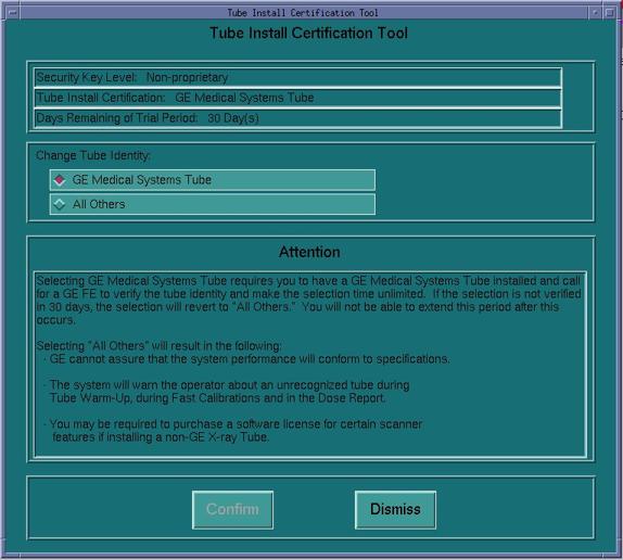 For GE Medical Systems Tube configuration, the Tube Install Certification Tool displays the number of Days Remaining in the Trial Period. A certified GE Field Service Engineer must confirm the tube identity during the trial period. If the trial period expires before a certified GE Field Service Engineer confirms the tube identity, the system will automatically default to "All Others" functionality.