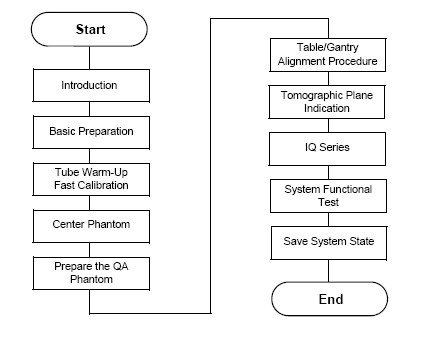 Four basic steps will be performed: Gantry Balance Check, Mylar Window Check (Warm up scans if tube is cold), Interconnectivity Map Scan List, and Fast Cal Air Scans.
