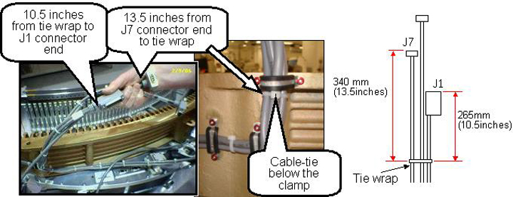 Install a cable tie (Ty-wrap), 265 mm (10.5 in.) from the end of the J1 cable connector and 340 mm (13.5 in.) away from the J7 connector as measured to the cable tie (Ty-wrap).