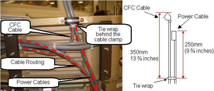 Apply a cable tie 250 mm (9 ¾ in.) away from the Power cable connector end and 350 mm (13 ¾ in.) away from the CFC cable connector end as measured to the tie wrap.
