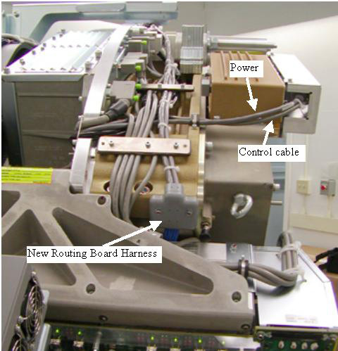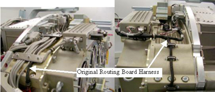 Use the two screws (46-328417P6) and two washers (46-328430P2) to secure the routing board cable large grey block to the 48V power supply side of the detector chassis. This block is pointed to inFigure 4 by the arrow labeled “New Routing board harness”.