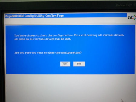 The disk configuration clearing needs to be performed by RAID control card WebBIOS utility.